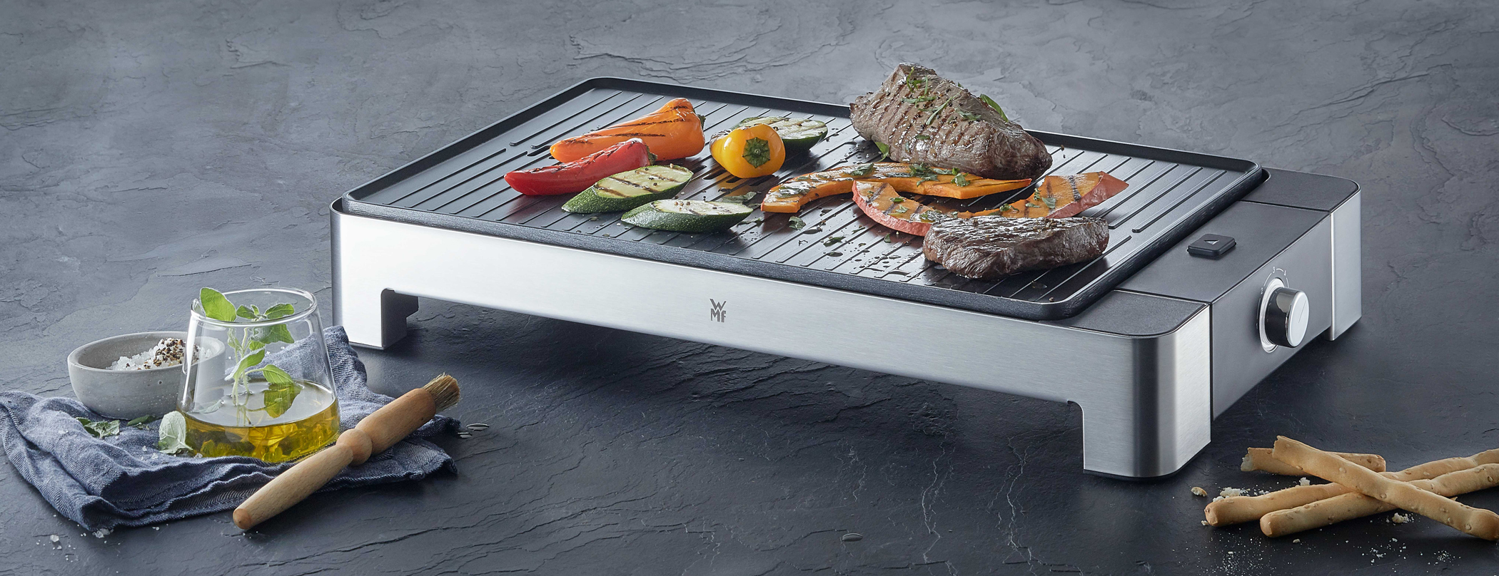 Durch das verbesserte „WMF Easy Handling“ lässt sich die Grillplatte durch einen einfachen Tastendruck entnehmen und ebenso einfach wieder einsetzen.