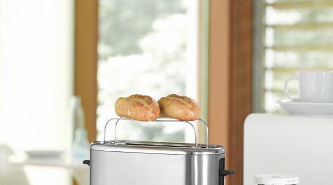 Der WMF Toaster Coup ist ein 1-Scheiben-Toaster. Er benötigt nur wenig Platz und kann trotz kompakten Maße sogar eine XXL-Scheibe Toast rösten. Mit dem integrierten Brötchenaufsatz können auch Croissants und Brötchen frisch zubereitet werden. Die Brotzentrierung sorgt für eine gleichmäßige Bräunung des Toasts. Die sieben variabel einstellbaren Bräunungsstufen ermöglichen das Rösten nach individuellem Geschmack. Die LED-beleuchteten Funktionstasten sind ein optisches Highlight und dienen einer einfachen Handhabung. Die Krümelschublade lässt sich auf Druck leicht öffnen und einfach reinigen lässt.