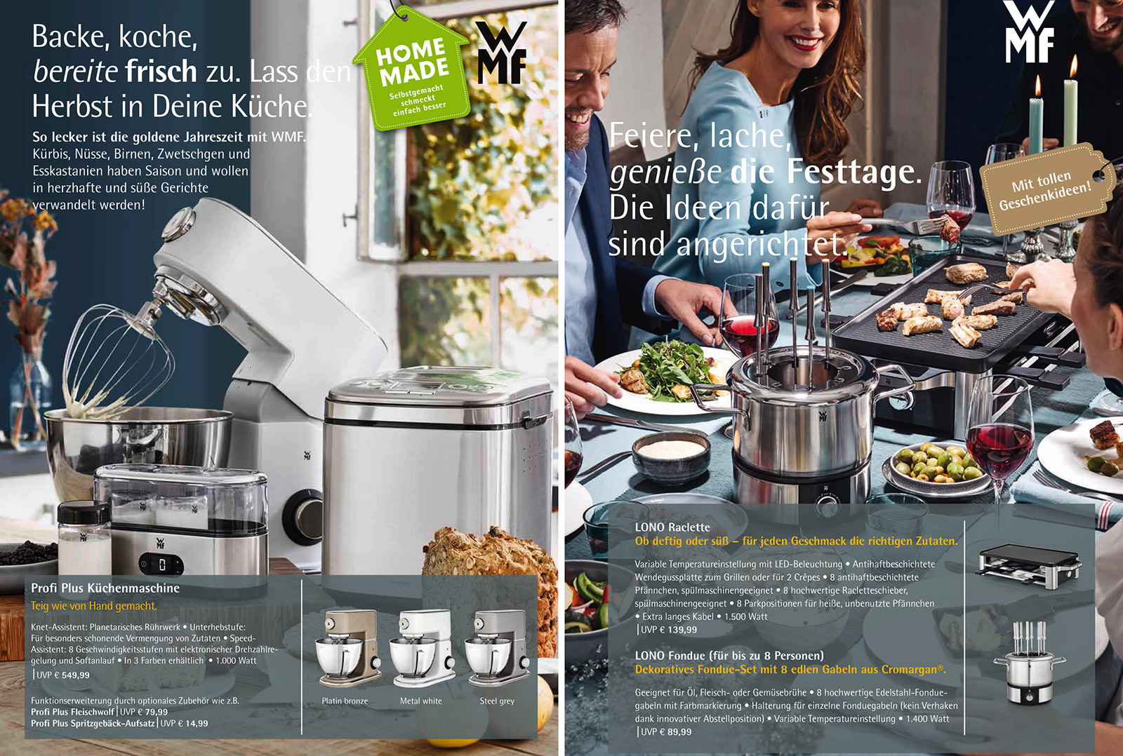 Mit zwei bundesweiten Beihefterkampagnen in der Publikumspresse startet die Elektrokleingerätesparte der WMF Group in den Herbst und ins Weihnachtsgeschäft. Der acht- bzw. zwölfseitige Beihefter bewirbt die IFA-Neuheiten: KÜCHENminis der dritten Generation, Lono Tee- und Wasserkocher 2in1, Lono Fondue, Lono Milk & Choc, Lono Sandwichtoaster und Lono Tischgrill Quadro.