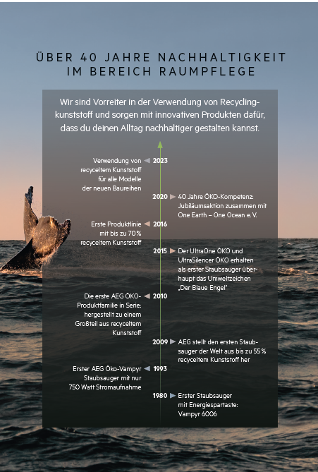 Vom ersten Staubsauger mit Energiespartaste über den weltweit ersten hergestellten Staubsauger aus bis zu 55% recycelten Kunststoff bis zur ersten Auszeichnung mit dem Umweltzeichen „Blauer Engel“ für Staubsauger überhaupt: Die Premiummarke AEG setzt im Bereich Raumpflege seit über vier Jahrzehnten Maßstäbe in Sachen Nachhaltigkeit.