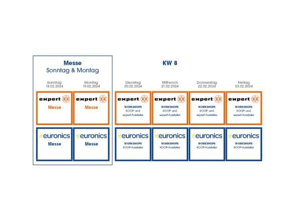 Im Februar 2023 fand die Kooperationsmesse KOOP von expert und Euronics erstmals physisch auf dem Messegelände Berlin statt und verzeichnete dort eine sehr gute Resonanz. Um die Veranstaltung für alle Beteiligten zukünftig noch kompakter und effizienter zu gestalten, haben expert, Euronics und die Messe Berlin ein optimiertes Veranstaltungskonzept für 2024 entworfen. Die wichtigste Änderung: Die gemeinsame KOOP-Halle kann von den Partnern beider Kooperationen gleichzeitig von den expert-Gesellschaftern und den Euronics-Mitgliedern besucht wird. Dadurch wird die Dauer der Messe auf zwei Tage reduziert, konkret: Sonntag, 18. Februar und Montag, 19. Februar 2024.