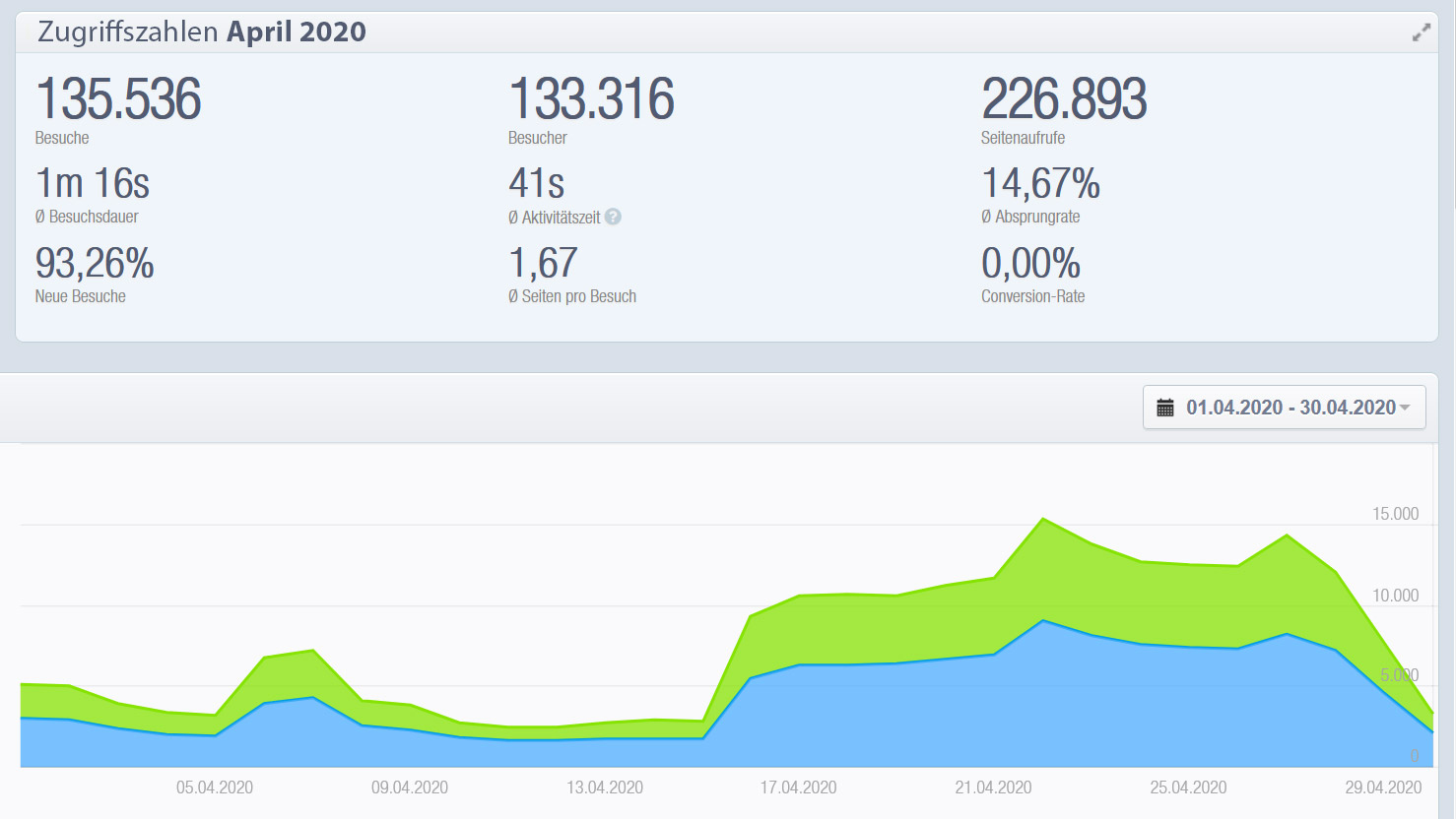 Unser neuer Corona-Ticker wurde im April in 7 Newslettern an 38.835 Email-Händleradressen versendet und 27.322 mal betrachtet. Eine Beachtungsquote von 70,89%.