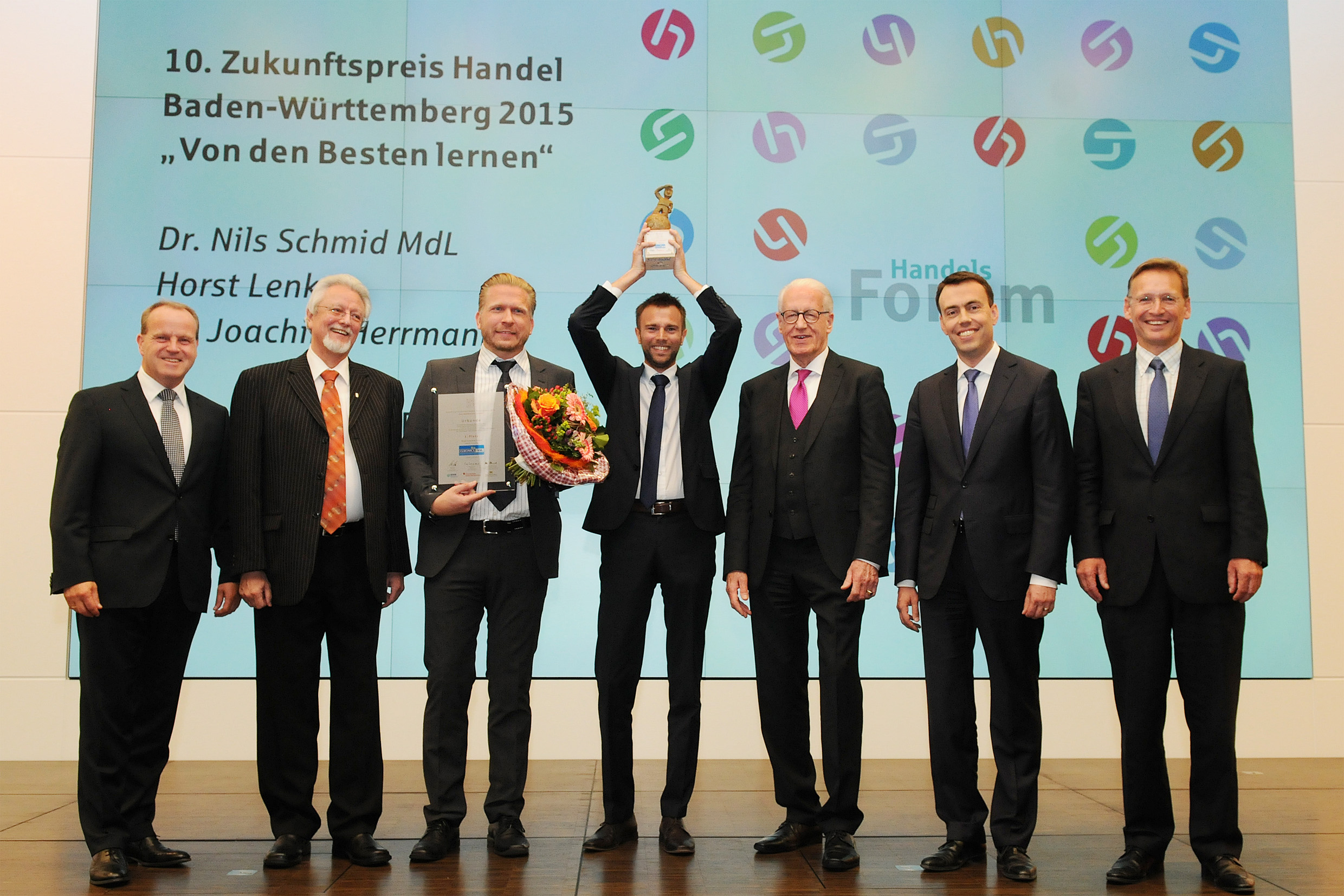 In Stuttgart wurde jetzt der „Zukunftspreis Handel Baden Würrtemberg“ verliehen. Hinter einem Edeka Supermarkt aus Heilbronn und einer Buchhandlung in Singen ging der 3. Preis an Euronics XXL in Tettnang. Überreicht wurden die Preise von Baden-Württembergs Finanz- und Wirtschaftsminister Dr. Nils Schmid MdL sowie von Peter Schneider MdL (Sparkassenverband Baden-Württemberg) und Horst Lenk (Handelsverband Baden-Württemberg) im Rahmen des Handelsforums in Stuttgart.