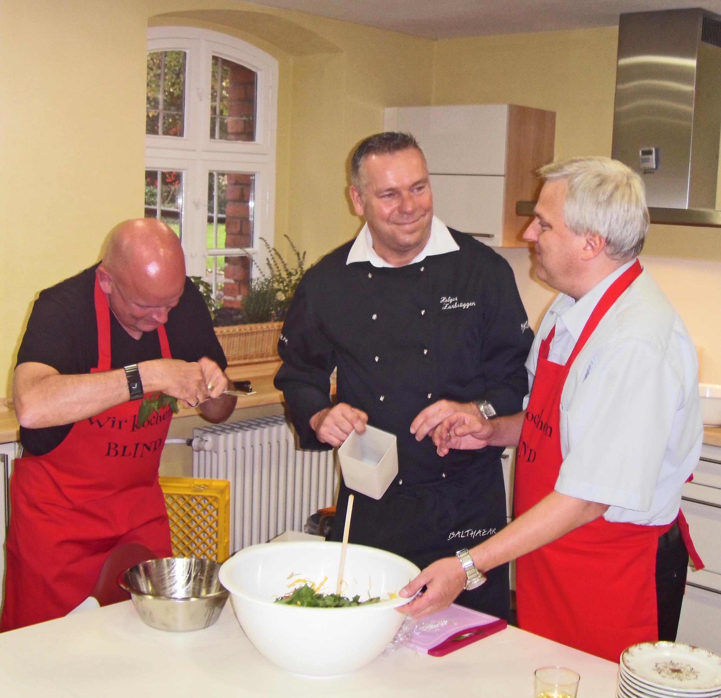 Die Spitzenköche Holger Zurbrüggen vom BALTHAZAR und Stefan Hartmann von HARTMANNs Restaurant ließe es sich nicht nehmen, zusammen mit den blinden Mitarbeitern die neue Küche einzuweihen und den Besuchern kleine Köstlichkeiten zu reichen. Die Besucher fühlten sich sofort wohl in der neuen Küche, streichelten die Tische und schmiedeten bereits nach fünf Minuten erste gemeinsame Kochpläne.
