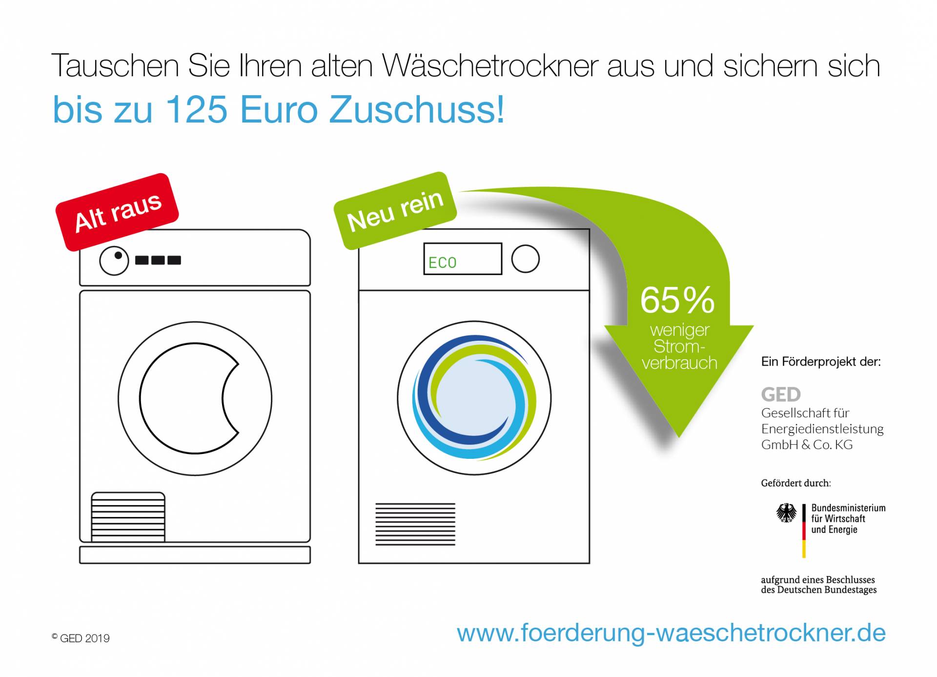 Ab sofort wird der Austausch eines alten Wäschetrockners gegen einen effizienten Wärmepumpentrockner der Energieeffizienzklasse A+++ mit bis zu 100 Euro bezuschusst. Gewährt wird dieser Zuschuss von der Gesellschaft für Energiedienstleistungen (GED) aus Berlin. Das Projekt ist Teil des Förderprogramms „STEP up! – Stromeffizienzpotentiale nutzen” des Bundesministeriums für Wirtschaft und Energie.