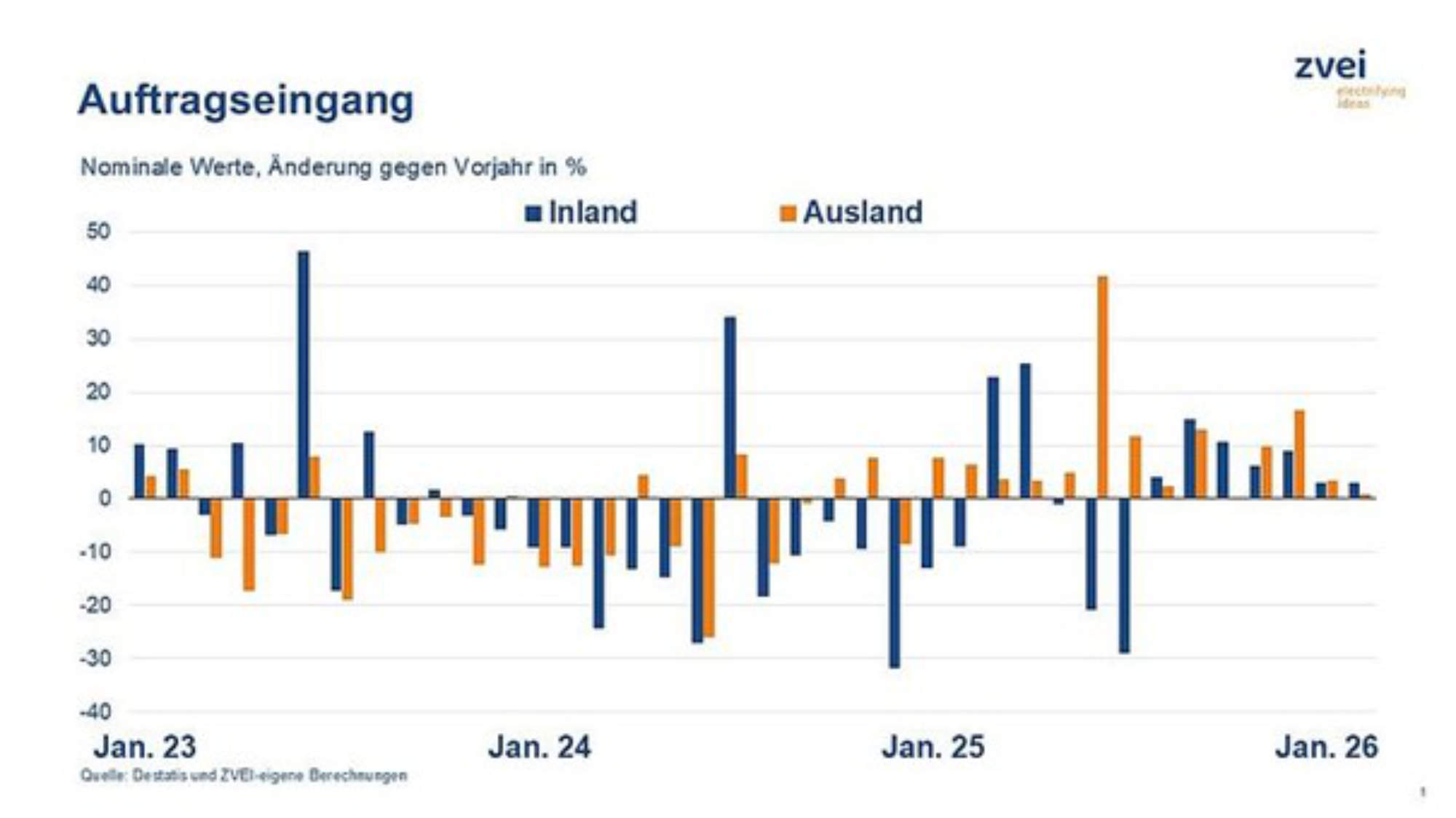 Beim Umsatz ergibt sich ein gemischtes Bild: Im Februar wurde mit 17,8 Mrd. Euro ein leichtes Plus von 1,3 Prozent erzielt. Treiber war das Inlandsgeschäft, während die Erlöse im Ausland zurückgingen. Für die Monate Januar und Februar zusammen ergibt sich nahezu Stagnation (+0,4 Prozent), wobei sich auch hier die schwächere Auslandsnachfrage bemerkbar macht.