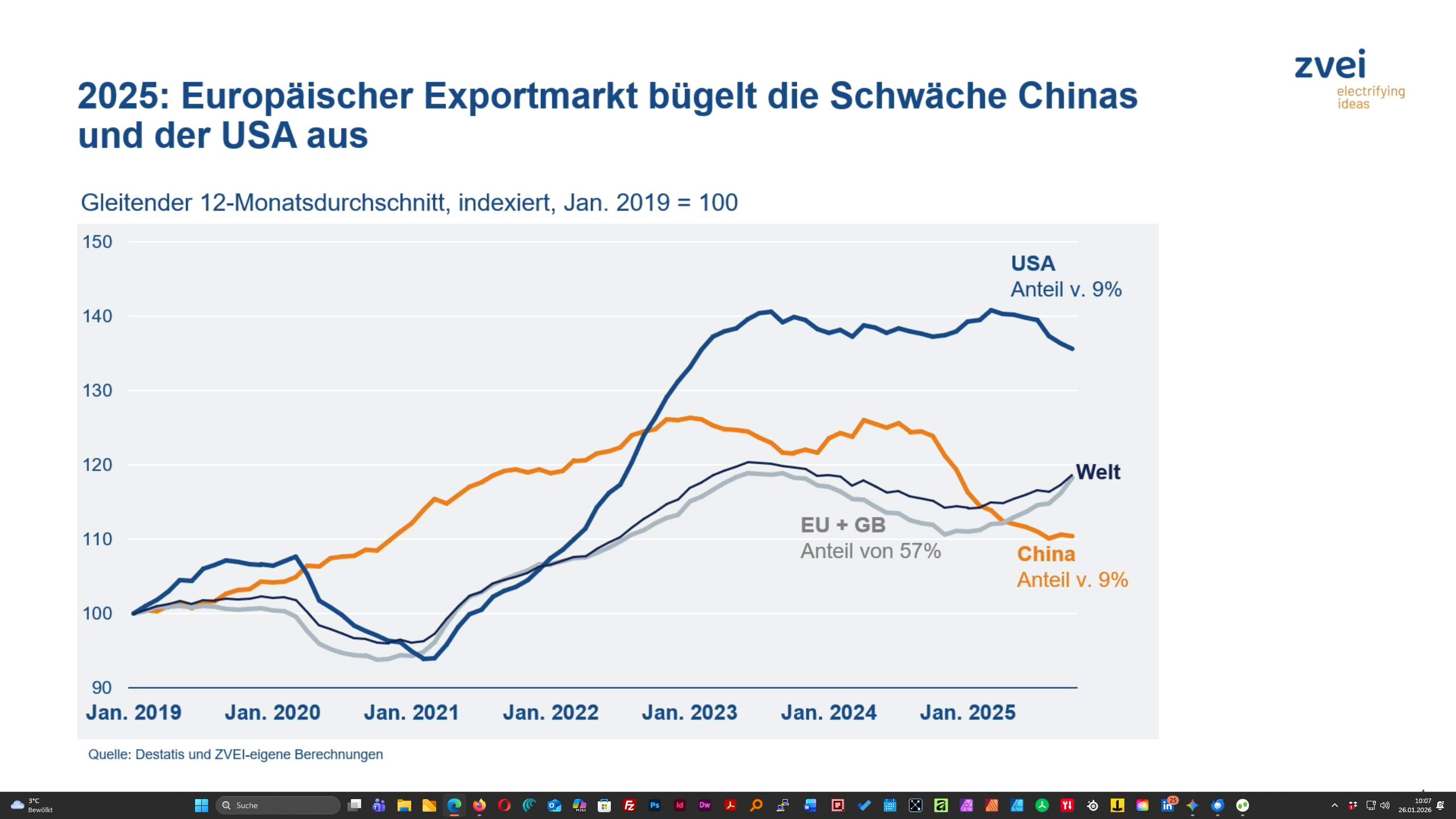 Nach einem massiven Einbruch von -8,8 Prozent im Jahr 2024 lag die reale Produktion 2025 bei etwa -0,5 Prozent. 2025 war geprägt von einer wirtschaftlichen Bodenbildung: Die nominalen Erlöse stiegen voraussichtlich auf 226 Mrd. Euro (+2,7 Prozent), während sich die Beschäftigung mit rund 877.000 Mitarbeitenden vergleichsweise stabil zeigte. Positive Impulse kamen insbesondere von den Auftragseingängen, die insgesamt um fünf Prozent zulegten. Auch die Exporte entwickelten sich robust: Mit einem Plus von 4,6 Prozent auf 236,2 Mrd. Euro trugen vor allem Ausfuhren in den EU-Binnenmarkt und nach Großbritannien dazu bei, Rückgänge in den USA und China auszugleichen. „Der europäische Binnenmarkt ist unsere Rückversicherung in unsicheren Zeiten.“ Diesen zu stärken, sei eine Pflichtaufgabe. Laut IWF wirken interne Hindernisse in der EU heute wie ein Zoll von 44 Prozent.
