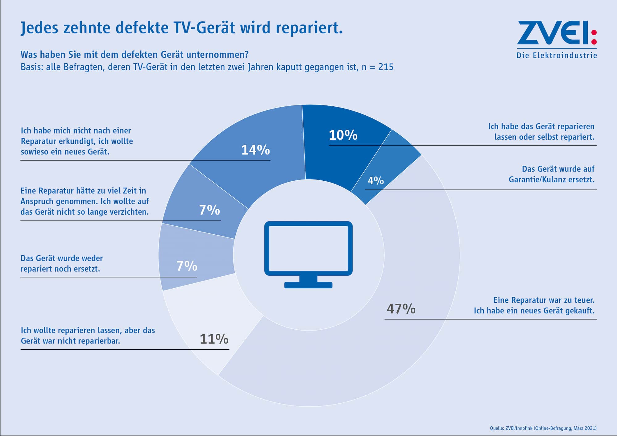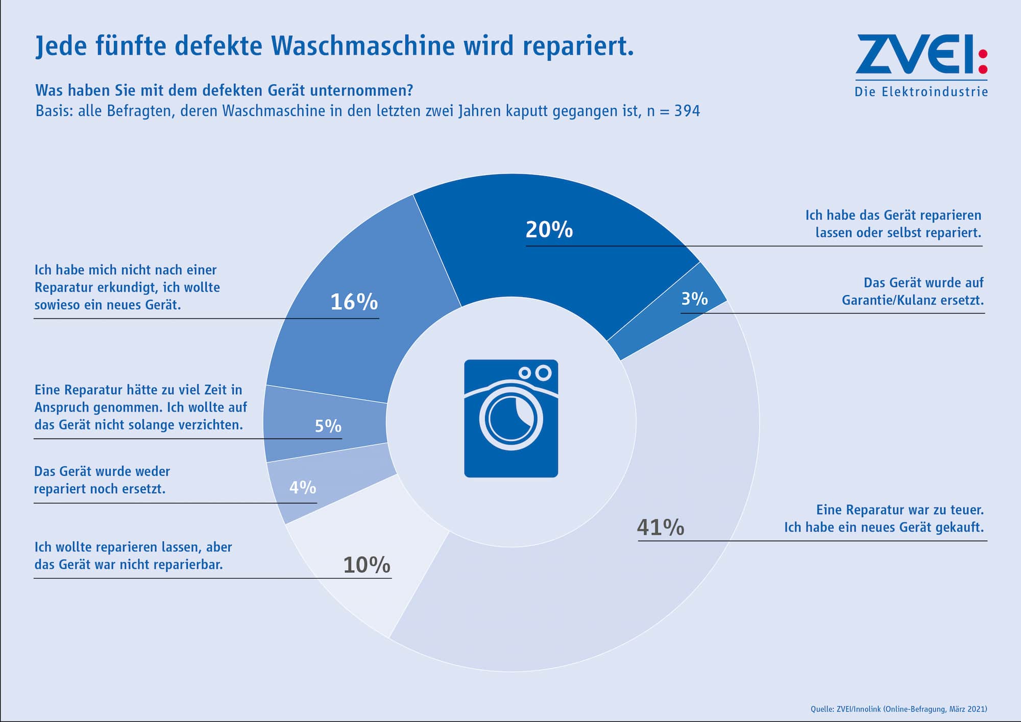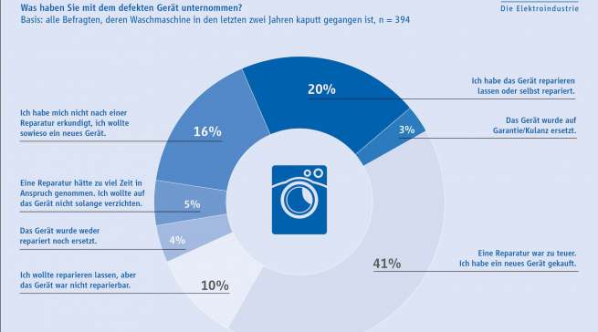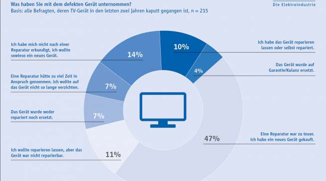 Repariert wurden defekte Geräte der drei abgefragten Produktgruppen laut Umfrage aber nur selten: Jeder Fünfte ließ eine defekte Waschmaschine in Stand setzen oder reparierte diese selbst, bei TV-Geräten haben dies lediglich 10% getan, bei Wasserkochern nur 8%. Geantwortet haben hier jeweils diejenigen, die zuvor angegeben hatten, dass in ihrem Haushalt in den vergangenen zwei Jahren ein entsprechendes Gerät kaputtgegangen war.