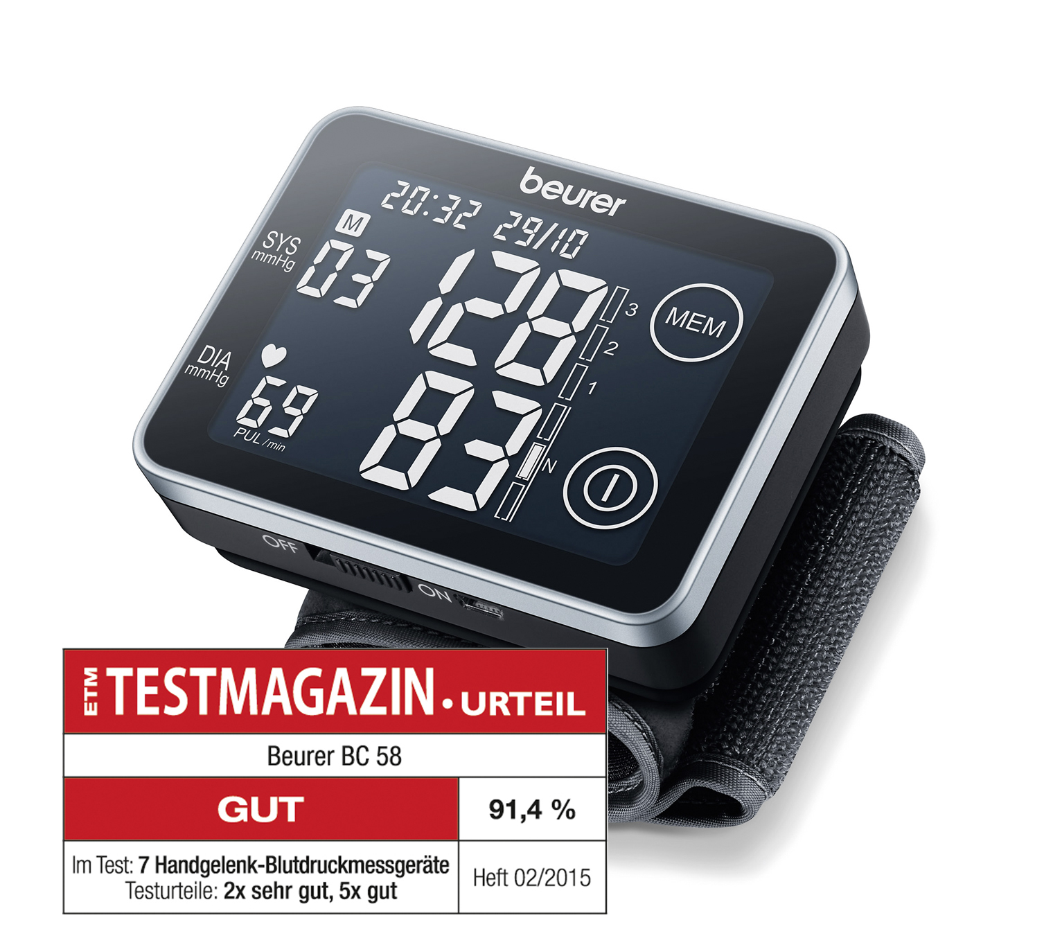 Zudem verglich ETM im aktuellen Oberarm-Blutdruckmessgerätetest neun unterschiedliche Produkte anhand der Kriterien Handhabung, Display, Manschette und Funktion. Auch hier ging Beurer – mit dem Oberarm-Blutdruckmessgerät BM 85 – als Testsieger hervor. Pluspunkte gab es für die Messgenauigkeit und die Möglichkeit der Datenübertragung via USB oder Bluetooth. Beim Test der kompakten Messhilfen erhielt das Handgelenk-Blutdruckmessgerät BC 58 mit Touch Screen Display das Testurteil „gut“ und weiß mit überdurchschnittlichen Leistungen in den Kategorien Handhabung, Display, Manschette und Funktion überzeugen.