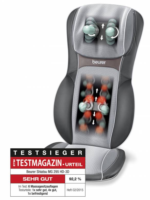 In Ausgabe 02/2015 hebt das ETM Testmagazin die Leistung der Massage-Sitzauflage MG 295 sowie des Oberarm-Blutdruckmessgeräts BM 85 von Beurer mit „sehr gut“ als Testsieger hervor. Im Vergleichstest stellte ETM sechs Massage-Sitzauflagen vor. Der Fokus wurde auf Verarbeitung, Handhabung und Funktion der Geräte gelegt. Als besonders positiv wurde bei der Massage-Sitzauflage MG 295 HD-3D die Möglichkeit der zuschaltbaren Nacken-Massage, Heizfunktion, Sitzkomfort sowie die Auswahl der Massagedauer und der zwei Geschwindigkeitsstufen bewertet.