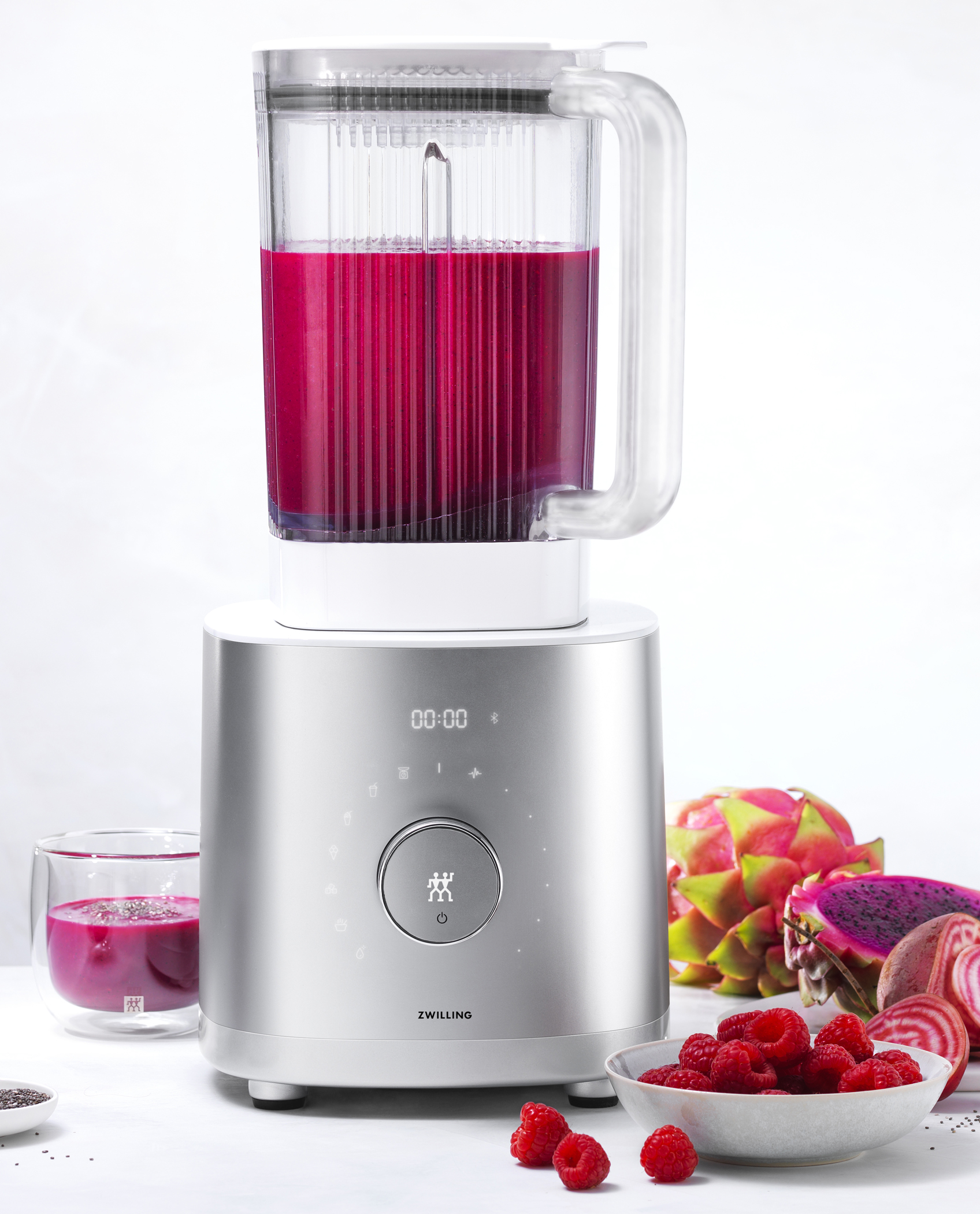Mit dem Hochleistungsstandmixer Pro können durch die integrierte Waage mit Tara-Funktion die Zutaten einzeln hinzugewogen werden. Zudem lässt sich das Gerät über Bluetooth mit dem Smartphone per Zwilling App steuern.
